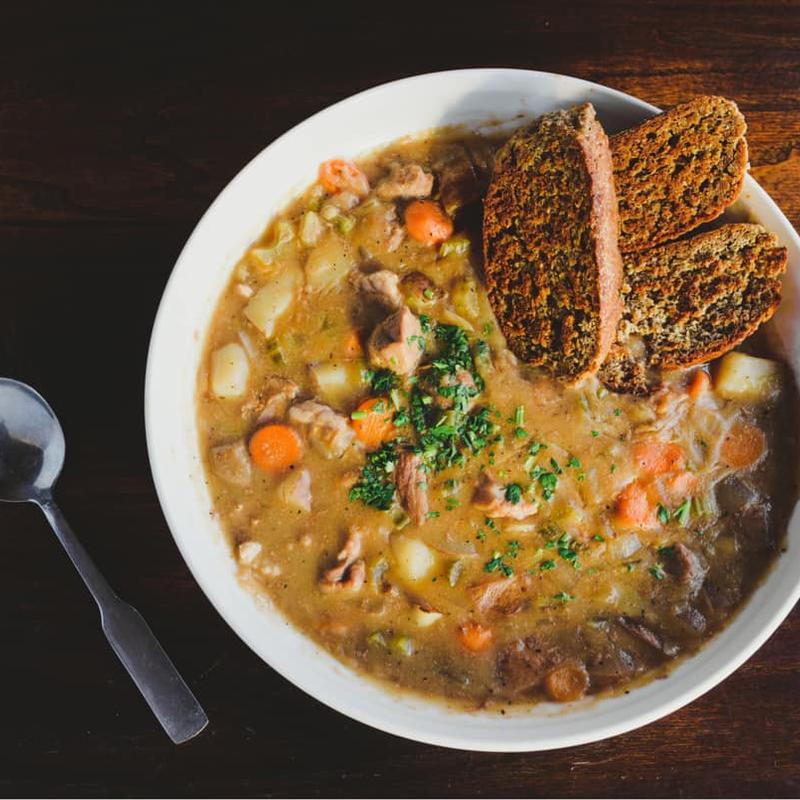 Classic stew made with tender chunks of lamb, carrots, red potatoes, celery, and onions in rich gravy enhanced with goodness. Served with homemade Irish brown bread