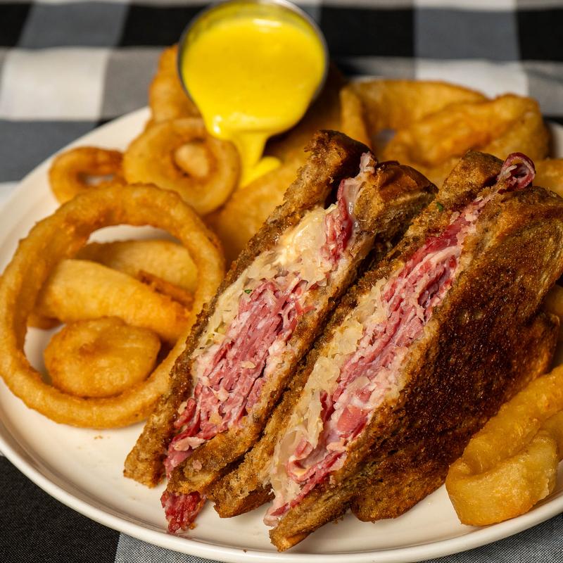 Our famous Reuben cut in quarters served with onion rings and honey mustard