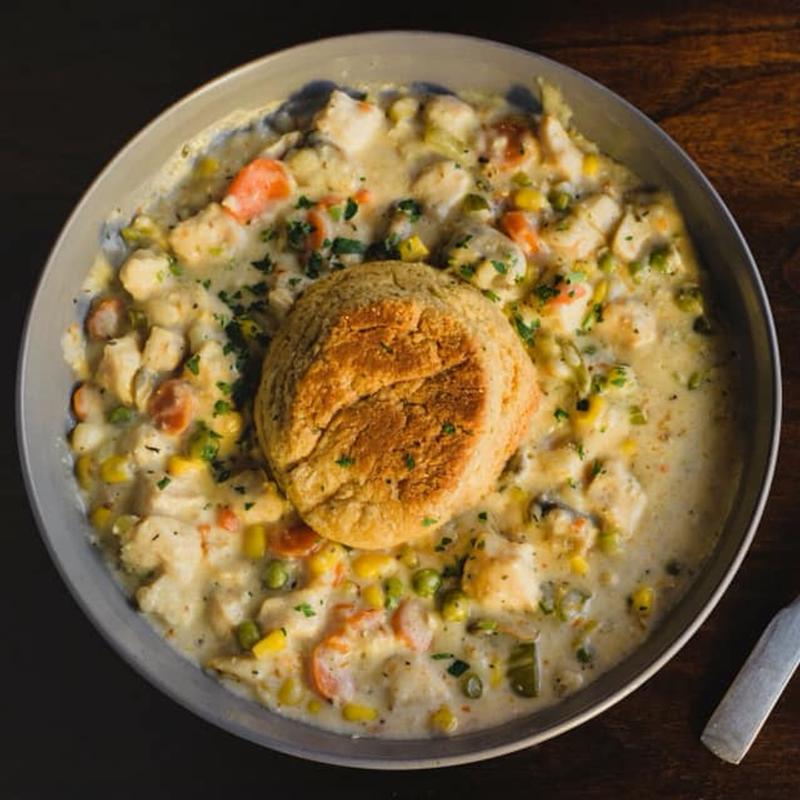 Creamy chicken stew with carrots and peas, topped with a buttermilk biscuit