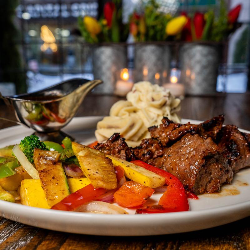 Marinated steak tips, grilled how you’d like, served with mash and veg with a whiskey demi
