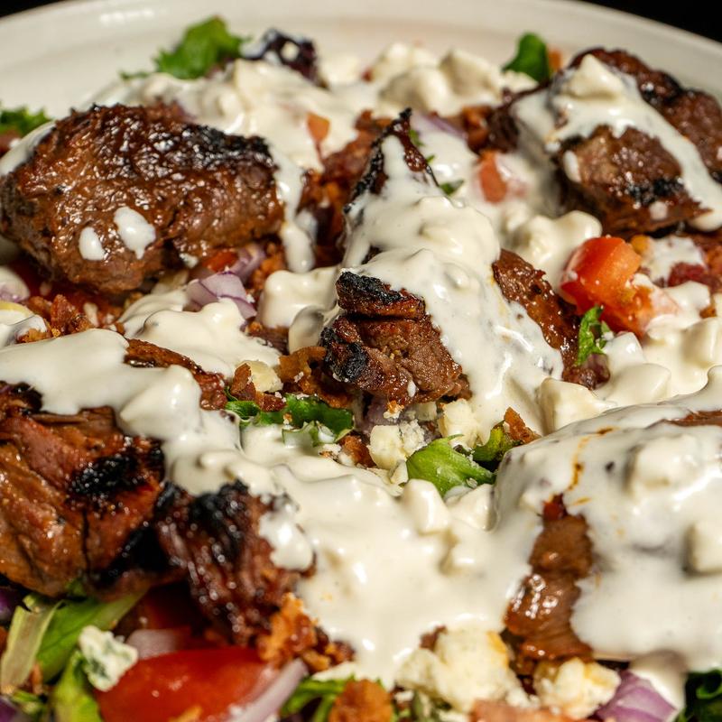 Mixed greens, crumbled bleu cheese, diced red onion, tomatoes, bacon, and marinated steak tips, grilled how you’d like